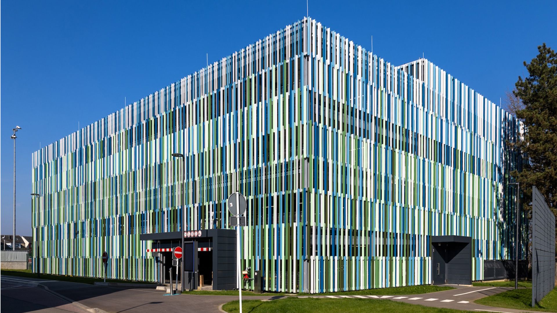 Le parking compact à Rodange (LU), aux dimensions de 33x38,5 m, se distingue par une façade marquante qui encadre le volume avec une construction en lamelles métalliques à l’aspect fluide. Cette structure assure à la fois la transparence nécessaire et une aération naturelle, primordiale pour la sécurité des divers niveaux du parking. L’effet est renforcé par des profils en L en aluminium aux couleurs distinctes, assurant une intégration harmonieuse dans le paysage verdoyant du parc voisin.