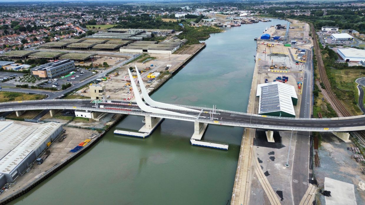 Le pont Gull Wing à Lowestoft (Royaume-Uni) dans le sud-est de l'Angleterre, est l'aboutissement d'un vaste projet destiné à améliorer la circulation dans et autour du port. Le pont se compose de deux approches et d'un pont basculant roulant central, représentant au total 2200 tonnes d'acier. Le pont basculant est le plus grand du genre au monde. Victor Buyck Steel Construction (VBSC) a construit le pont entre 2021 et 2024. La première étape a consisté à acheminer les trois parties (totalisant 700 tonnes) de la rampe d'accès nord. Particularité de cette opération : la partie située au-dessus de la voie ferrée, y compris le tablier en béton et les finitions (1600 tonnes), a été mise en place pendant une interruption du trafic ferroviaire. Les autres parties ont été soulevées et mises en place à l'aide d'une grue sur chenilles lourde installée sur le ponton de transport. VBSC a transporté et monté le pont d'accès sud en 4 parties (totalisant 818 tonnes), qui ont été assemblées à l'aide de joints boulonnés. Pour le pont basculant à rouleaux, un arrêt intermédiaire à Westdorpe était nécessaire lors du transport par voie maritime. Les bras ('J-beams') y ont été montés et le pont a été achevé dans la mesure du possible, y compris les accessoires pour le mécanisme de mouvement. Les poutres en J ont constitué un défi majeur en raison de l'importance des travaux de soudure, des tolérances très strictes, des exigences particulières liées aux processus de déchargement et de l'accessibilité limitée. Afin d'éliminer les tensions dues à la soudure, les poutres en J ont été recuites dans un four spécialisé. Le pont, qui pesait plus de 1 000 tonnes avec son lest de transport, a été mis en place à l'aide de vérins de levage depuis le ponton après avoir été transporté par voie maritime. Le contrepoids en béton dans les poutres en J a été inséré sur place. Grâce au mécanisme à rouleaux, le chenal peut être utilisé sur toute sa largeur après l'ouverture du pont. En position ouverte, le sommet des poutres en J s'élève à 61 m au-dessus du niveau de l'eau. Le pont a été officiellement inauguré le 7 septembre 2024. Le pont Gull Wing est un joyau architectural et une prouesse technique. Le nom et la forme du pont Gull Wing font référence aux mouettes omniprésentes à Lowestoft.