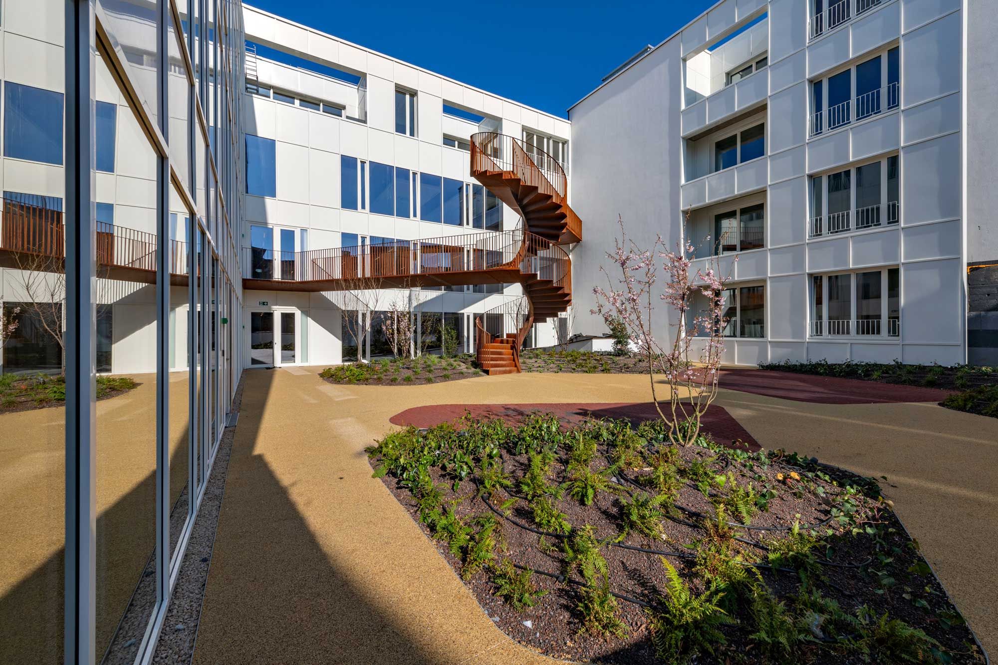 Le projet de réhabilitation lourde (démolition, reconstruction complète tout en conservant les façades) d’un îlot situé rue Madeleine à Liège comprend la création d’un patio végétalisé couvrant un parking. Ce lieu central du projet nécessite la création de connexions verticales. Un escalier hélicoïdal en acier auto-patinable dessert 2 passerelles de connections distribuant les étages supérieurs. Structurellement, le souhait est de limiter les appuis et autres contraintes qui parasitent la lecture de l’objet. L’escalier est composé d’un unique limon central porteur (caisson constitué de tôle de 20 mm) et de marches (de 8 mm) en porte-à-faux. Les tôles constitutives du limon sont fortement gauches (non développables) nécessitant un grand savoir-faire dans la mise en force de ces tôles. Ce caisson est le seul élément structurel de l’escalier qui doit également reprendre les charges des passerelles qui s’y connectent. La disposition des passerelles permet de créer un ensemble équilibré sur 3 appuis révélant le savoir-faire historique des chaudronniers. Les passerelles sont des caissons en acier trapézoïdaux à section variable de 30 cm de hauteur. L’utilisation de l’acier permettait ici de réaliser une structure légère et élégante, facilement transportable en cœur d’ilot.