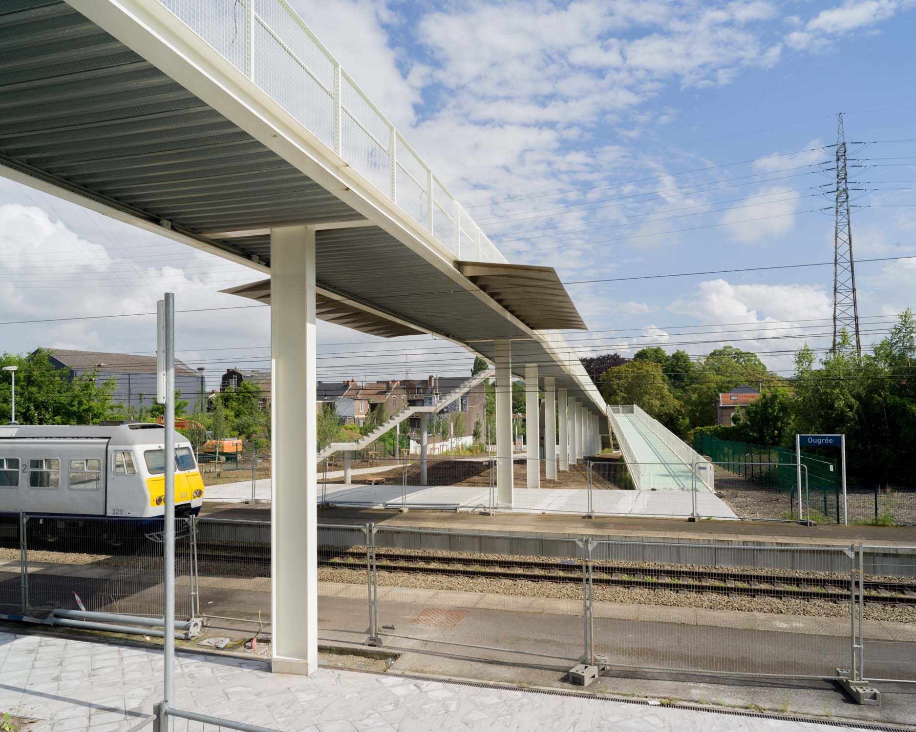 D’une longueur de 258 m, la passerelle achevée à Seraing, relie le parc Trasenster aux Ateliers Centraux, ancien site industriel en cours de réhabilitation. Conçue dans un style architectural minimaliste, la passerelle s’intègre parfaitement au paysage urbain et naturel. Elle accueille les piétons et les cyclistes et se compose d’un tablier en béton soutenu par des poutres continues et des poutres transversales en acier. La construction a utilisé une structure primaire préfabriquée en acier pour une installation efficace. Le tablier du pont est construit en béton à l’aide d’un coffrage perdu en acier et soutenu par des poutres de bordure HEB280 continues qui sont reliées à des poutres transversales en acier massif. Ces poutres reposent sur des colonnes en profilés d’acier HEA600 fixées dans des fondations carrées en béton. Le pont s’étend sur une distance régulière de 7,75 m, sa plus longue portée s’étendant jusqu’à 17,2 m au-dessus des voies ferrées. La passerelle joue un rôle central dans la promotion de la mobilité durable et contribue au paysage urbain grâce à sa conception réfléchie.