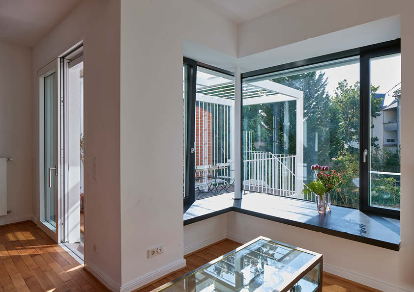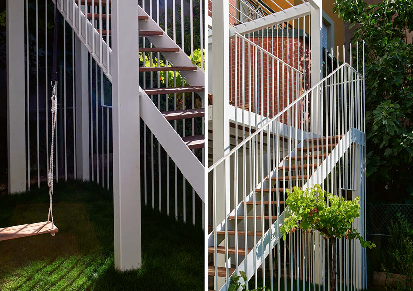 Deze smeedijzeren verandastructuur heeft de allure van een klein tuinpaviljoen. Het terras fungeert als een platform met twee niveaus. Beneden ontvouwt de ruimte zich tot een speelplek voor kinderen, inclusief een aan het gebouw bevestigde schommel, een ‘cottagesfeer’ en een raam dat uitzicht biedt op de tuin. De 1,5 ton zware structuur is geïnspireerd op het befaamde ‘Dom-Ino’-systeem van Le Corbusier en bestaat volledig uit S235-staal. Het gebruik van staal liet de ontwikkeling van een verfijnde, uitgepuurde structuur toe, waardoor er een slanke, rationele constructie ontstond. De prefabricage in het atelier zorgde ervoor dat het geheel snel en netjes gemonteerd kon worden op de werf. De verandastructuur heeft ook een uitzonderlijk lange levensduur dankzij de corrosiebestendige afwerking (verzinking en poedercoating).