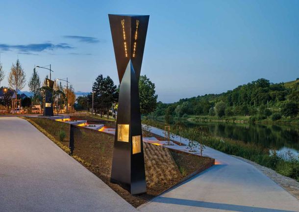 Stalen zuilen en kunstwerk voor Legendenpfad